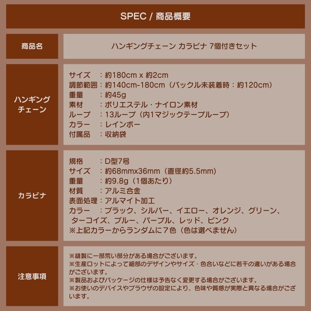 内容品:ハンギングチェーン x 1、カラビナ7個(色は選べません)、収納袋