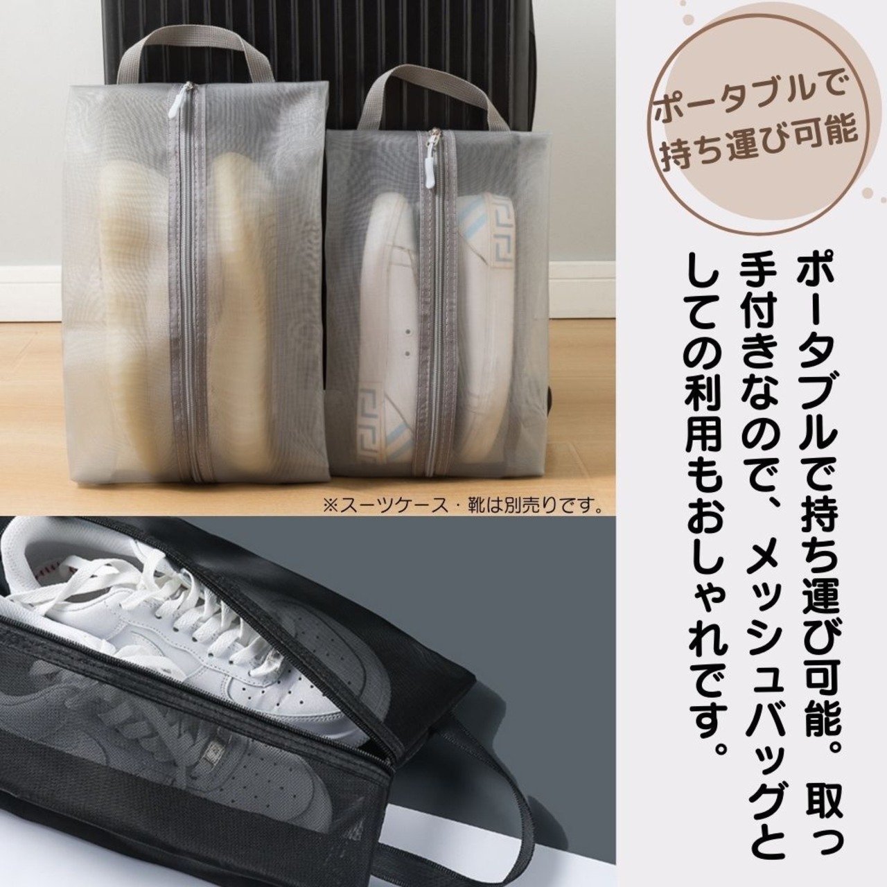 靴や小物の収納に便利なメッシュケース。外出時はもちろん、自宅でもすっきりと収納できる優れものです。