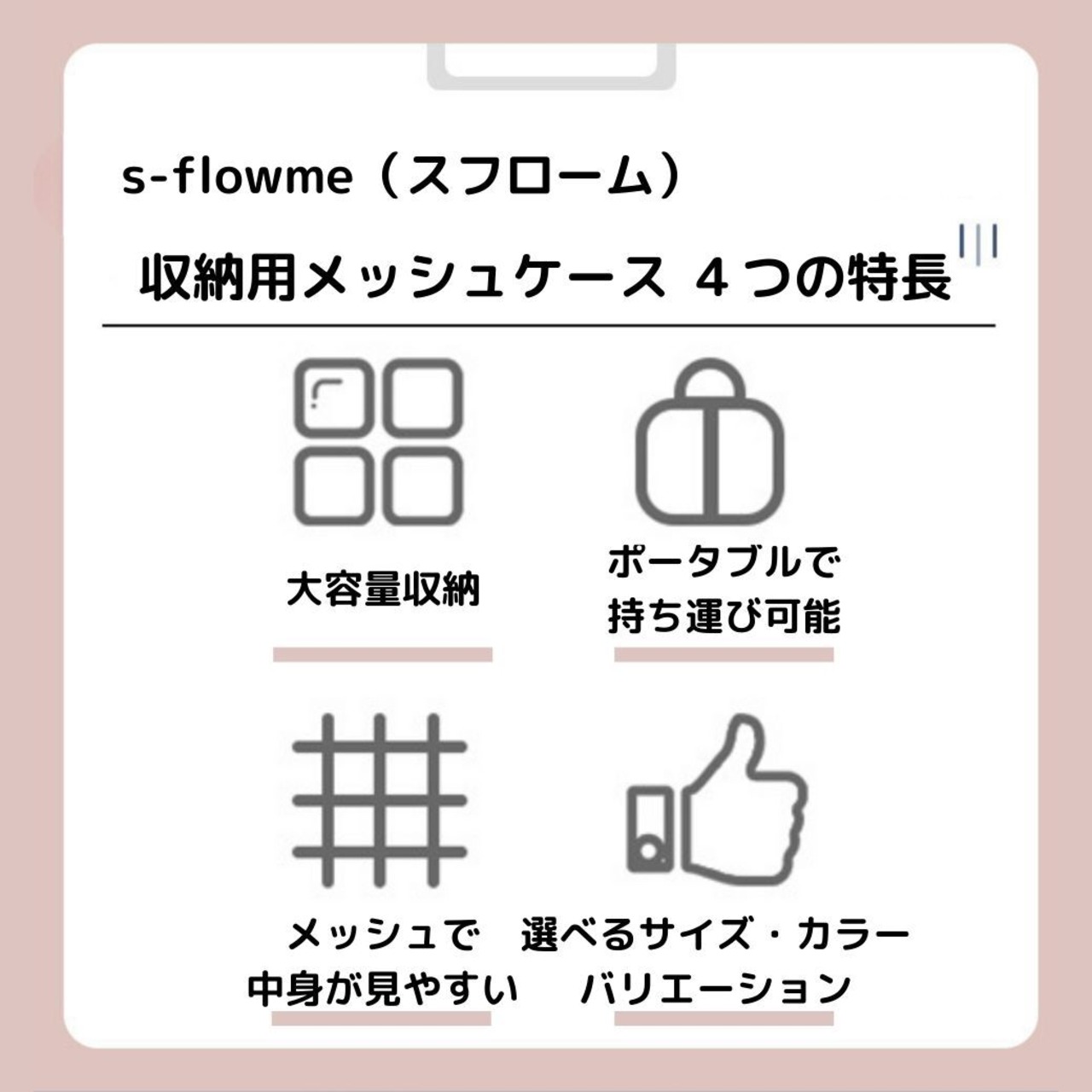 【収納用メッシュケース 4つの特長】