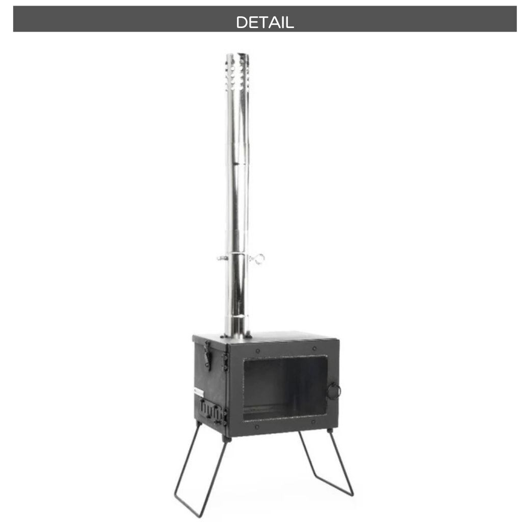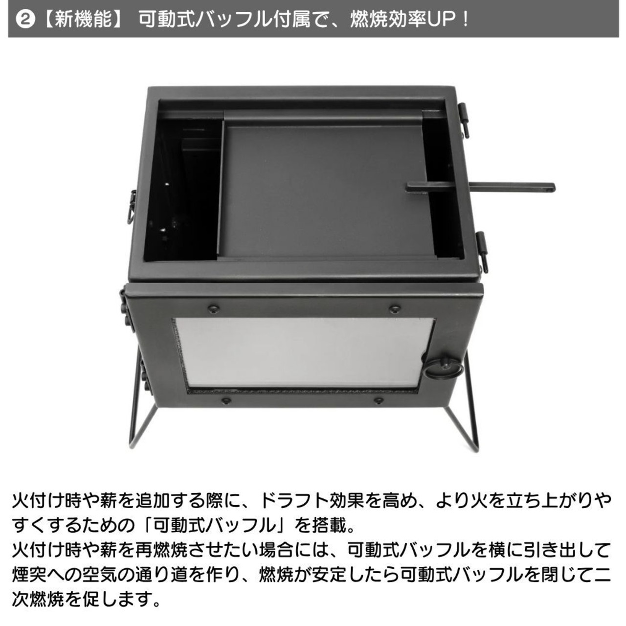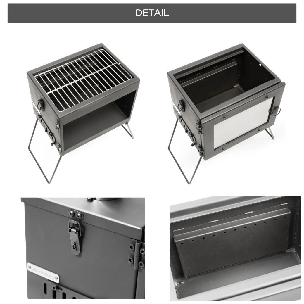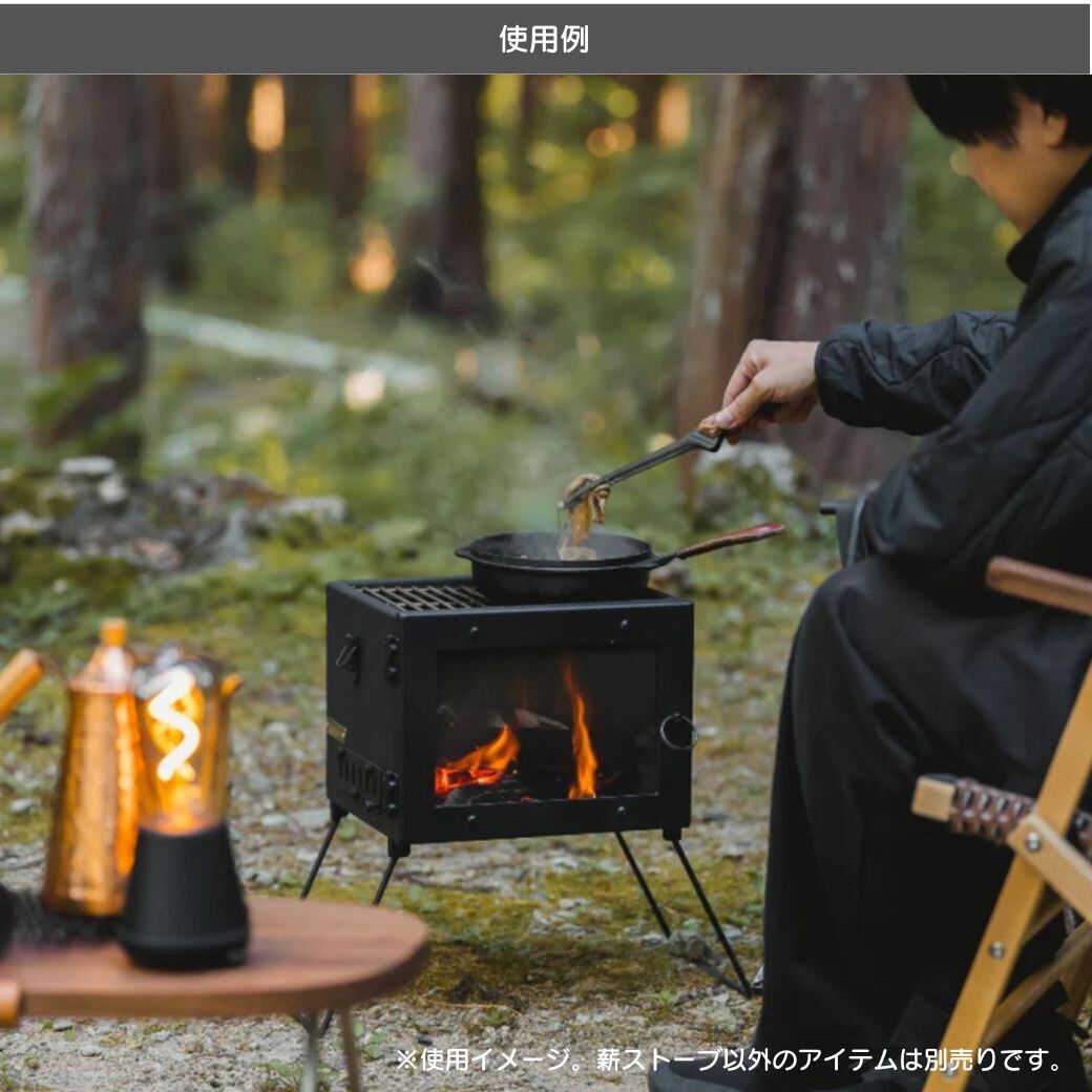 全辺30cm以下・本体重量6.7kgとコンパクトで持ち運びやすく、焚き火台とグリルの機能を兼ね備えた二次燃焼薪ストーブです。