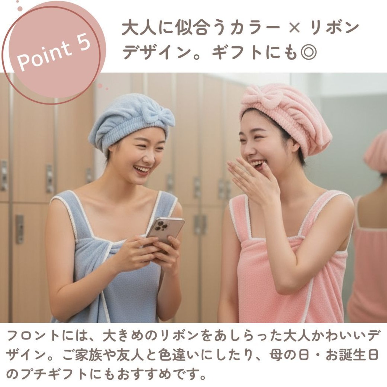 髪はタオルキャップに、身体は着るタオルに包まれることで、ロッカールームやサウナでの待ち時間も、濡れた髪や冷えを気にせずゆったり過ごせます。