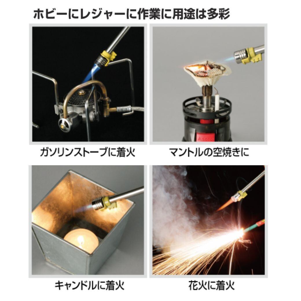 さまざまなものに安全着火。燃料は充てん式。経済的なカセットガスの他、ライターガスも使用できます